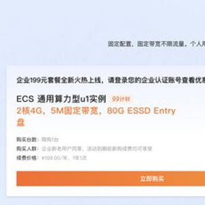 ECS 通用算力型 u1,2 核 4G,5M 固定带宽,80G ESSD Entry 盘。199.00 / 年,1 年 1 次,企业新老用户同享,活动到期前新购续费均可享受。