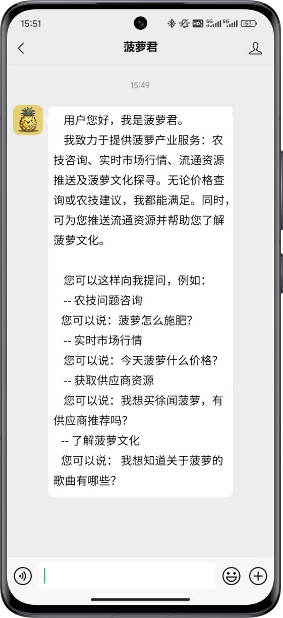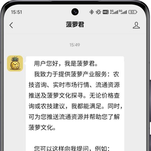 2、定制化服务:围绕徐闻菠萝产业全链的痛点难点,为徐闻菠萝定制 AI“菠萝君”,提供种植管护、销售流通、产销对接、菠萝衍生品推荐、文化宣传、出口指南、电商指导等多方面问题解答和服务。