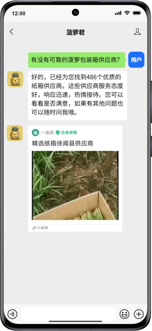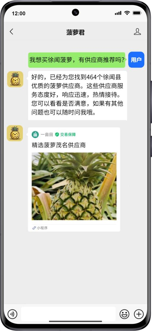 AI“菠萝君”公众号将接入“徐闻菠萝通”小程序,实现公众号用户与小程序供应商的流量互通。在 AI“菠萝君”内建立徐闻菠萝协会会员名单库,包括供应商的基本信息、产品信息、质量认证等信息。采购商通过需求提问触发 AI“菠萝君”智能匹配最适合的供应商。通过智能推送优质菠萝产品及产品信息,实现精准匹配,提高对接效率,让采购商能买到保真、保优的徐闻菠萝。