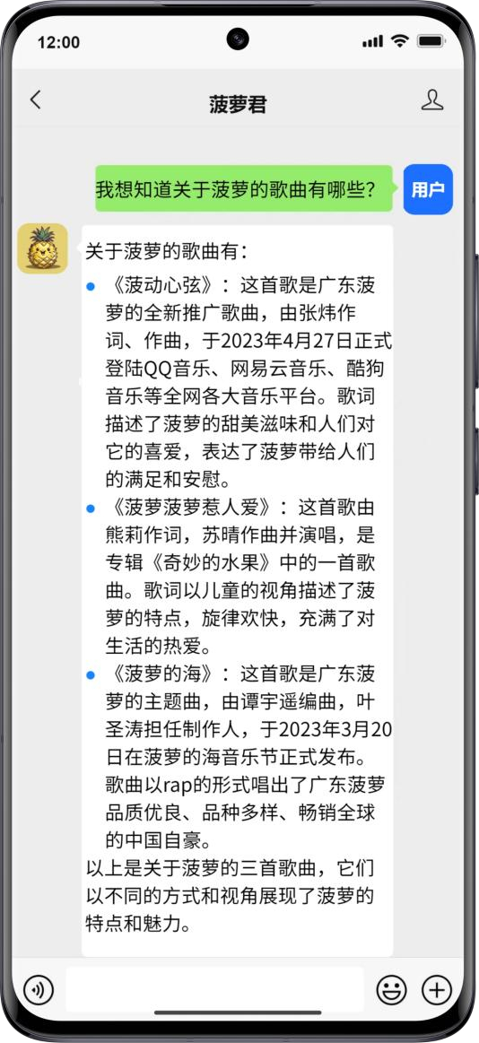 AI“菠萝君”将集成菠萝诗词、歌曲、文旅景点、历史典故等,为用户输出徐闻菠萝种植历史、文化、艺术知识。此外,围绕徐闻菠萝节、百千田头直播大培训等活动,为采购商提供活动须知、果园推荐等 24 小时服务。通过全方位服务来到徐闻的采购商,助力菠萝系列活动宣传推广和产业文化的传承发展,增加采购商对徐闻菠萝的认同感和好感度,从而提升徐闻菠萝品牌价值。