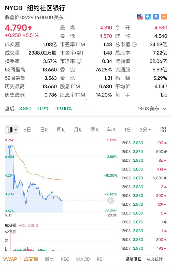 受此消息影响,纽约社区银行盘后大跌。截至记者发稿,该行股价在美股盘后跌近20%。