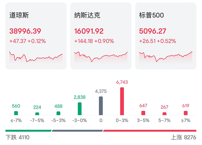 当地时间2月29日周四,美股三大指数集体收涨。截至当日收盘,道指上涨47.37点,报38996.39点,涨幅为0.12%;纳指上涨144.18点,报16091.92点,涨幅为0.90%;标准普尔500指数上涨26.51点,报5096.27点,涨幅为0.52%。