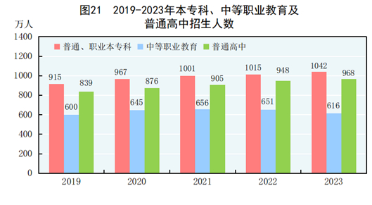 全年研究生教育招生130.2万人,在学研究生388.3万人,毕业生101.5万人。普通、职业本专科招生1042.2万人,在校生3775.0万人,毕业生1047.0万人。中等职业教育[71]招生616.5万人,在校生1737.9万人,毕业生537.1万人。普通高中招生967.8万人,在校生2803.6万人,毕业生860.4万人。初中招生1754.6万人,在校生5243.7万人,毕业生1623.6万人。普通小学招生1877.9万人,在校生10836.0万人,毕业生1763.5万人。特殊教育招生15.5万人,在校生91.2万人,毕业生17.3万人。学前教育在园幼儿4093.0万人。九年义务教育巩固率为95.7%,高中阶段毛入学率为91.8%。