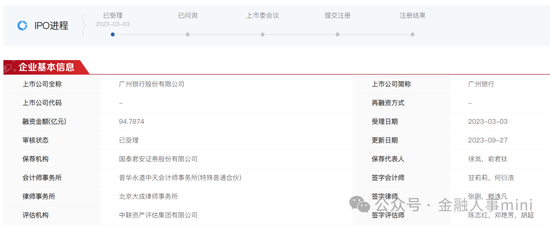 2023年3月,广州银行正式冲击深交所主板IPO,保荐机构为国泰君安证券,拟募资94.79亿元,旨在补充其核心一级资本,提高资本充足水平。
