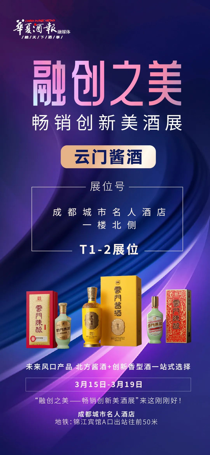 3月15日至19日,云门酒业将在成都城市名人酒店一楼北侧“融创之美——畅销创新美酒展”T1-2展位欢迎大家!