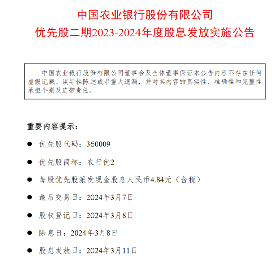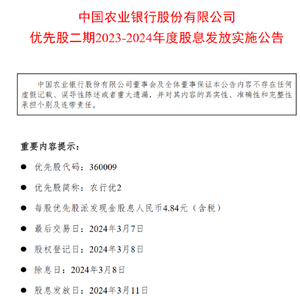 3月1日金融一线消息,农业银行发布优先股二期2023-2024年度股息发放实施公告。公告显示,农业银行优先股二期(以下简称“农行优2”)2023-2024年度股息发放方案,已经该行2024年1月31日召开的董事会会议审议通过。具体实施事项公告如下: