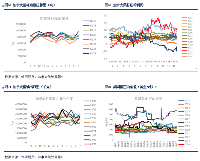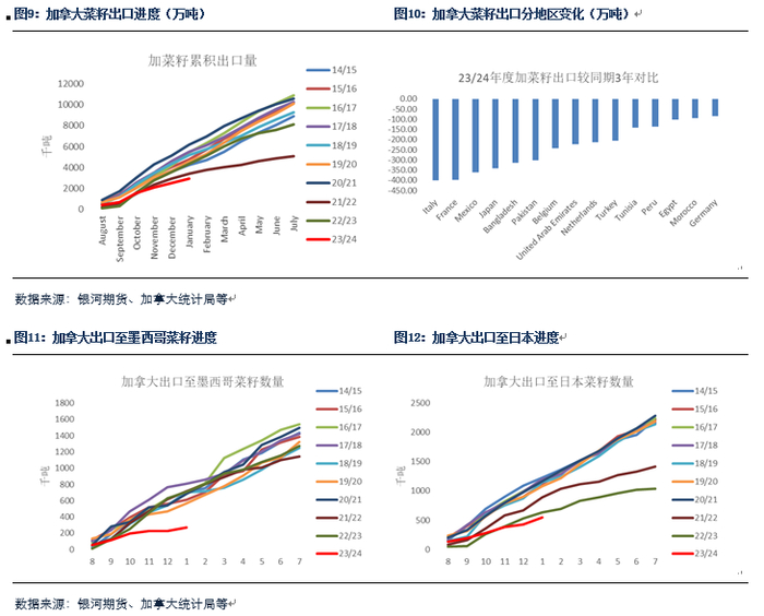 1.加菜籽供应压力较大。由于加拿大菜油出口增速放缓,压榨增速整体不及预期,同时菜籽出口受全球丰产以及澳菜籽结转库存较高冲击影响,出口进度也相对偏慢,因此我们预计加菜籽后续出口压力会相对较大,后续库存可能将更多向国内堆积,价格重心承压;