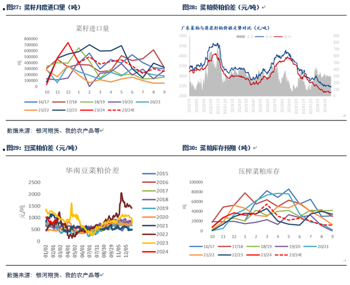 整体来看,我们认为当前豆菜粕在国内外市场基本面都呈现一定的分化态势。国内豆粕基本面虽然相对偏弱,但实际影响可能更多体现在基差上,单边在巴西供需边际好转以及国内买盘支撑下可能会表现的相对偏强。菜粕自身矛盾比较显著,一方面豆粕基差的下行可能会导致菜粕需求被进一步挤占,另一方面菜粕与葵粕价差较大也导致菜粕被替代的压力在不断增加,今年水产需求备货可能看不到太明显的亮点。而供应方面看,加拿大基于其自身压力将继续给出压榨利润,因此后续供应压力仍将体现。