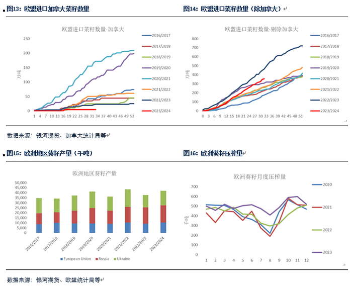 实际上当前加菜籽出口进度一直不及预期,根据加拿大谷物委员会出口数据来看,截止225号当周,加菜籽累积出口量仅336.52万吨,同比下降33.8%。加菜籽出口进度持续放缓的原因比较综合,其中欧盟、中国、日本、墨西哥等主销区进口量下滑都比较明显,从出口减幅来看,截止1月,对比过去3年平均水平,加拿大菜籽出口下降最大的几个地区分别是意大利、法国、墨西哥、日本等地,中国出口同比虽然有所下滑,但对比过去3年来看,仍然相对较高,至少处于历史正常水平。墨西哥、日本等地减少加菜籽进口主要因采购地转向澳大利亚,澳菜籽结转库存偏高导致其23/24年度仍然有竞争力。欧盟进口加菜籽数量减少原因则更加综合,一方面因为其自身丰产,对外依赖度减少,另一方面也因为乌克兰丰产以及澳大利亚仍然具有竞争力的因素,数据上看,我们剔除欧盟进口加拿大菜籽数据,可以看到,截止当前,欧盟共累积进口356万吨,虽然低于去年463万吨的水平,但基本是最近几年的新高。此外,我们认为这也与今年欧洲及周边地区葵籽产量较高所致,数据显示2023年欧洲葵籽累积压榨增加约,这将较大程度对菜籽及菜油需求形成冲击,当前欧盟地区菜葵价差略有走强。