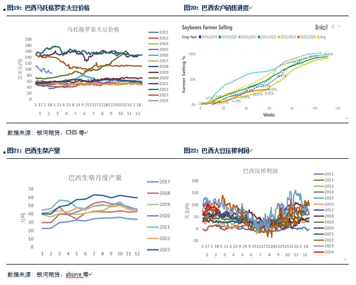 总体来看,在巴西收割压力结束后,基本面状况在不断向好。一方面,价格连续下跌后,巴西内陆价格已经开始不断逼近成本线附近,这在一定程度上削弱了农户销售的积极性;另一方面,随着收割的不断推进巴西减产问题也在不断被市场关注,二者叠加下,供应压力已经开始有所减弱。而需求方面来看,2月底至3月初以来,巴西上调生柴掺混比例,将一定程度对豆油需求形成刺激,同时最近几年巴西国内养殖业也处于增长涨,有利于豆粕消费。因此在终端状况较好的情况下,我们预计将进一步对巴西国内压榨形成拉动,而在此期间,巴西国内一直维持着较好的压榨利润,最近一段时间从新闻上也不难看到巴西有采购巴拉圭大豆的信息。我们预计巴西今年大豆出口量可能下降至9100-9200万吨左右,去年同期为1亿吨。