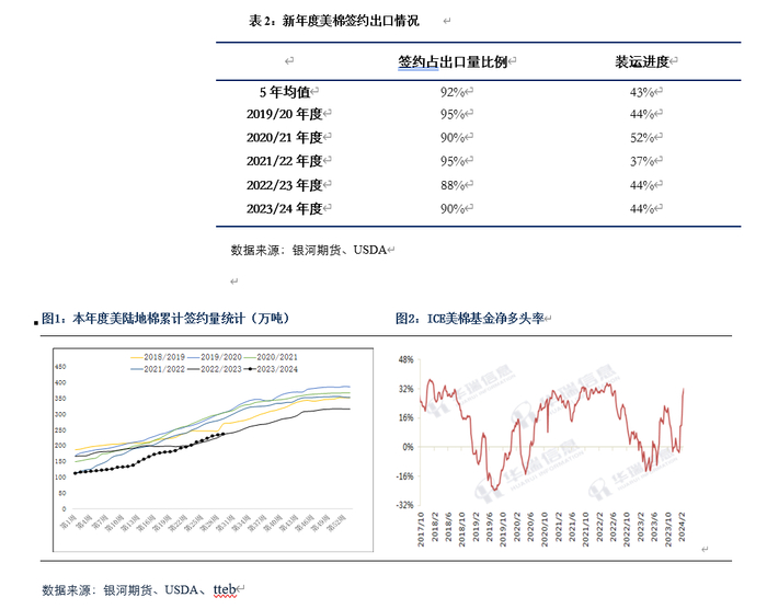 本年度美棉销售进度表现尚可,2月平均每周签约量达到大约在4.3万吨左右,根据USDA数据,截至2月15日,美2023/24年度陆地棉累计签约量为236.72万吨,签约进度为90%,较5年均值低两个百分点,累计装运量为115.13万吨,装运进度为44%,较5年均值高一个百分点。当前东南亚市场表现较乐观,尤其是越南、印度开机率持续增加使得整体国际市场对未来棉花消费情况保持乐观态度以及根据CFTC数据显示,截至2024年2月20日,ICE期棉基金净多头率为32.28%,处于历年同期高位。综合各个因素影响,当前美棉走势偏强,预计3月美棉将大概率继续维持高位。