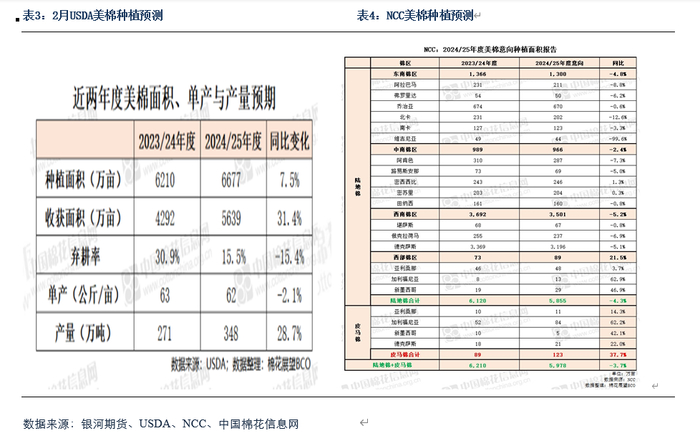 国际市场需求端近期东南亚市场表现尚可,尤其是印度越南开机率大幅增加并且从美棉签约量以及签约进度表现来看,当前国际市场对未来下游消费表现相对乐观。本年度全球棉花总产量不及去年;消费表现虽优于去年但仍较历史数据来看仍偏低;而期末库存虽有调减但依然高于去年水平。根据最新USDA全球棉花种植意向来看,预计24/25年度棉花总产量、总消费较本年度相比将有所调增,其中最新美棉种植意向有所调增;弃种率有所调减。但NCC对于新年度美棉种植面积预测则认为将会缩减。考虑到两家机构可能存在方向差异,目前来看当前受美棉走势偏强影响可能会导致未来棉花种植意向较高,但未来美棉价格走势能否持续的不确定性较大,因此未来美棉种植面积调整空间较大,整体不确定性较高。预计3月美棉走势略偏强但能否持续不确定性较大。