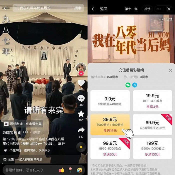 为了吸引用户,平台通常会设置10集免费观看。在前面集数的吸引下,对剧情感兴趣的用户就会忍不住下单购买。以“网剧吧”为例《我在八零后当后妈》,一集剧情需要150看点,最低充值9.9元,获得1400看点,大约可以看十集,充值越多,送的看点数越多。不同平台的价格各不相同,看完这部剧,花费的价格在9.9元-99元不等。