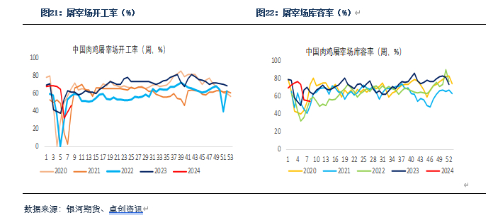 2024年2月屠宰企业开工率回升,冻品库容率下降。卓创资讯数据显示,2月22日国内重点白羽肉鸡屠宰企业平均开工率为46.47%;冻品平均库容率54.35%。由于2月毛鸡供应减少,处于春节假期,屠宰企业开工率处于低位,下游走货一般,冻品库容率也在下降。3月毛鸡供应会增加,下游需求也在上升,预计3月开工率会大幅上升,库容率也会缓慢上升。