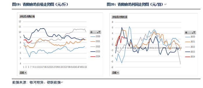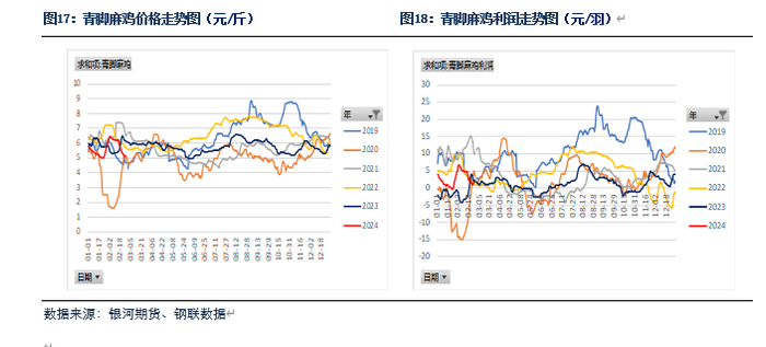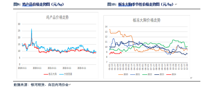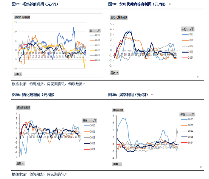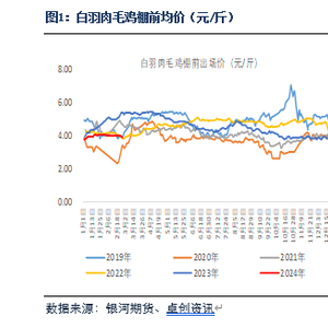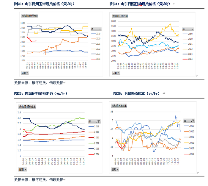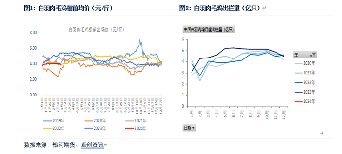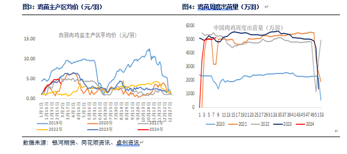 鸡苗方面,2024年2月鸡苗出苗量增加,鸡苗价格也高位回落。在产父母代种鸡存栏持续上涨,鸡苗供应量会继续增加。3月养殖户存在补栏需求,预计鸡苗价格回落空间有限。