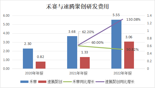 在研发投入上,2020年-2022年,禾赛的研发费用为2.3亿元、3.68亿元及5.55亿元;速腾聚创的研发费用为0.82亿元、1.33亿元及3.06亿元。其中,两家企业在2021年的同比增长率几乎相同,但2022年禾赛的研发费用增长率明显高于速腾聚创。