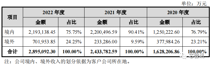 报告期内,龙旗科技主营业务收入中,境内收入的占比分别为 76.79%、90.41%和 75.75%。其中,2021年境内收入占比较高主要是因为:(1)来自小米的收入及占比呈增长趋势,而公司对小米主要为境内销售;(2)公司成功开拓中国联通、荣耀等国内头部品牌商客户。2022 年境外收入占比提升,主要由于公司向三星的销售收入大幅增长。