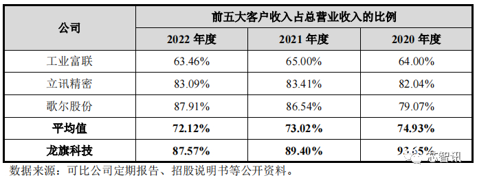 与华勤技术、闻泰科技、工业富联、立讯精密、歌尔股份等相关厂商对比,我们可以看到,龙旗科技的前五大客户占营收收入的比例大幅高于行业平均水平。