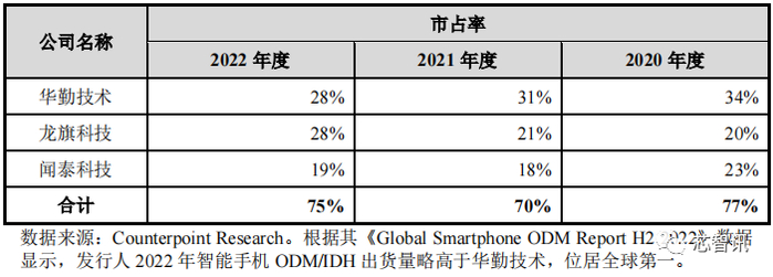 与此同时,ODM 行业的市场集中度也较高。根据 Counterpoint 数据,2021年全球智能手机 ODM/IDH 出货量近 4.83 亿台,占全球智能手机市场份额达39.4%,较去年增长 2.71%。其中,华勤技术、龙旗科技及闻泰科技为全球智能手机 ODM/IDH 市场的龙头厂商,三家公司的市场占有率在 2022 年达 75%,市场保持高度集中的格局。