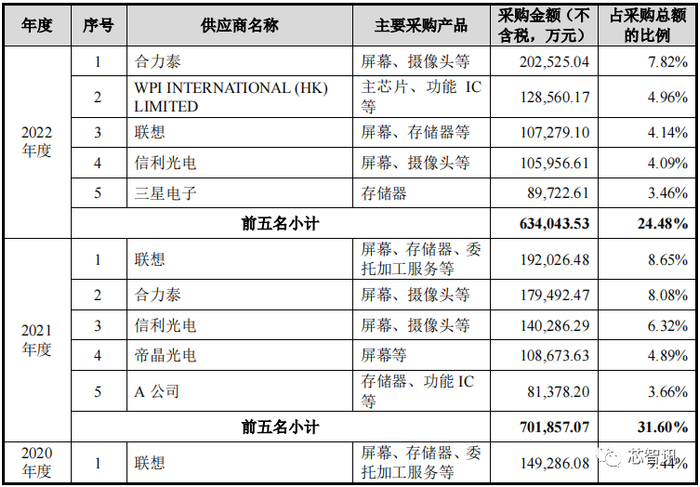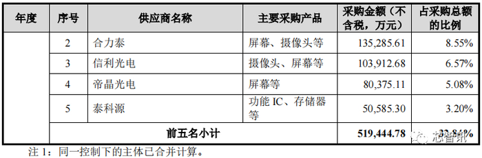报告期内,龙旗科技向前五大供应商采购金额分别为 519,444.78 万元、701,857.07万元和 634,043.53 万元,占采购总额的比重分别为 32.84%、31.60%和 24.43%,占比呈下降趋势。公司业务规模较大,采购类别相对较多,因此前五大供应商采购金额占采购总额的比例相对较低。