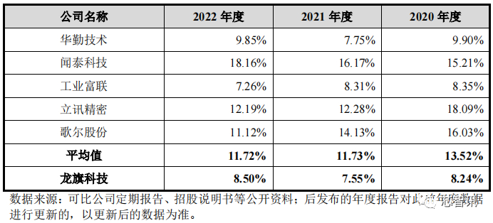 报告期内,龙旗科技综合毛利率分别为 8.24%、7.55%和 8.50%,2023 年 1-6 月上升至 12.32%。虽然毛利率变动趋势与同行业可比公司基本一致,毛利率水平与同行业可比公司相比略低。