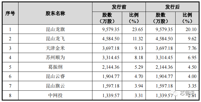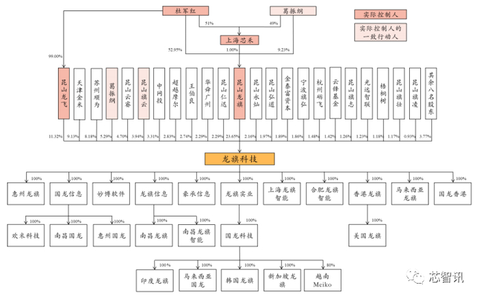 根据招股书显示,龙旗科技董事长杜军红先生为龙旗科技的实际控制人。杜军红通过昆山龙旗(23.65%)、昆山龙飞(11.32%)直接控制了龙旗科技34.97%的股权。同时,昆山旗云以及担任龙旗科技的董事、总经理的葛振纲均为杜军红的一致行动人,使得杜军红实际控制了龙旗科技44.20%的股权。