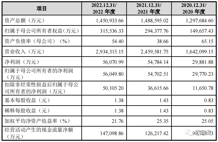 业绩表现方面,招股书显示,2020年至2022年(以下简称“报告期内”),龙旗科技营业收入分别为164.21亿元、245.96亿元和293.43亿元,三年累计营收达703.6亿元;净利润分别为2.99亿元、5.48亿元、5.61亿元,三年累计净利润为14.08亿元;实现归属于母公司股东的净利润2.98亿元、5.47亿元和5.60亿元,三年累计归母净利润达14.05亿元。