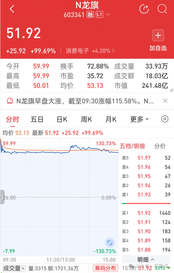 从龙旗科技的上市首日的股价表现来看,当日开盘价为59.99元/股,较发行价暴涨131%;收盘价为51.92元/股,较发行价仍暴涨99.69%;以收盘价计算,龙旗科技的市值约241.48亿元,仅有与其业务模式类似的华勤技术(532.01亿元)一半不到,同样也不到闻泰科技(508.56亿元)的一半。