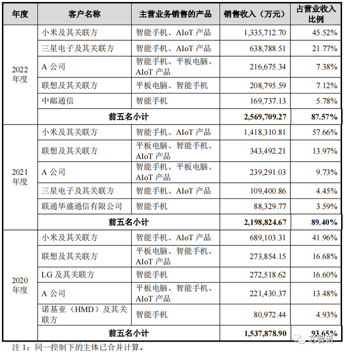 值得注意的是,报告期内,发行人成功开拓三星电子、OPPO、中国联通、荣耀、vivo、中邮通信、中国移动等头部品牌商客户,客户结构进一步均衡优化。2023年1-6月,公司向小米的销售收入占比已经降低到了37.83%。