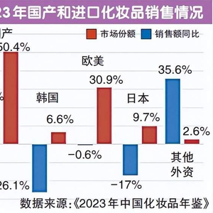 美妆行业媒体青眼情报发布的《2023年中国化妆品年鉴》显示,2023年,国货美妆销售额同比增长21.2%,市场份额达50.4%,首次超过外资化妆品品牌。2023年“双11”大促,国货美妆的表现强势。中信证券研报显示,2023年“双11”国货护肤类市场占有率从2022年的20%提升至38%,彩妆类由2022年的25%提升至33%。