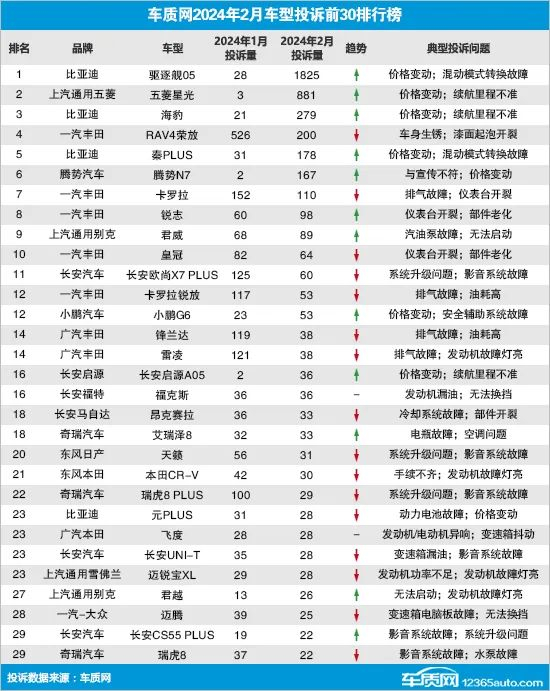 数据显示,本月车质网受理的有效投诉信息共涉及753款车型,其中投诉达两位数(含)以上的车型184款。此外,车质网本月共接到车企针对投诉的回复14,556条(含部分之前月份投诉的回复)。在去除投诉人因为车企解决得当而自愿申请撤诉的信息后,2024年2月投诉量前30的车系(车型)排名如下: