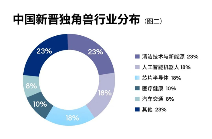 去年中国新增的独角兽公司中,清洁技术与新能源板块的贡献度在迅速降低,由2022年的约50%下降至2023年的23%;而人工智能机器人相关的企业贡献占比则从2%上升18%。此外,芯片半导体板块对中国独角兽增量的贡献也在增加,今年共有9家芯片半导体公司,贡献了中国约18%的独角兽增量,去年这一数字仅为11%。