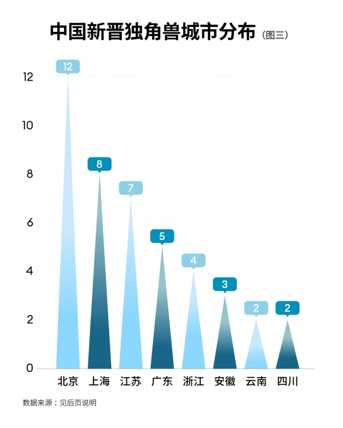 2023年,北京创造了独角兽总数的近三分之一,时隔一年反超上海、广东重回第一。(见图三)北京新增的独角兽中近6成与人工智能技术密切相关;上海则是机器人相关的独角兽继续发力,如智元机器人与达闼机器人等均在今年获得巨额融资。