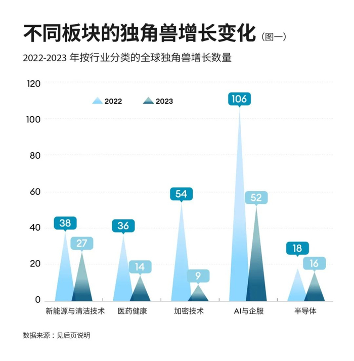 1.2023年,AI与企业服务板块的新增独角兽数量仍维持一个较大基数,以52家的数量占到了全球新增独角兽总数的约30%。