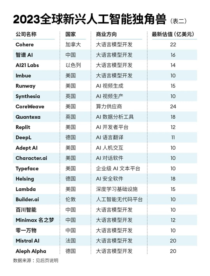 从商业方向的分类上看,中国和欧洲的新兴人工智能公司更关注于底层大语言模型技术的开发;美国则是在Open AI带领下的各类商业化应用开发活跃。