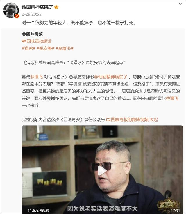 2月29日,《猎冰》总导演高群书(@他回精神病院了 )转发一条与@四味毒叔 对谈的视频,并评论姚安娜在《猎冰》中的表现:“对一个很努力的年轻人,既不能捧杀,也不能一棍子打死。”