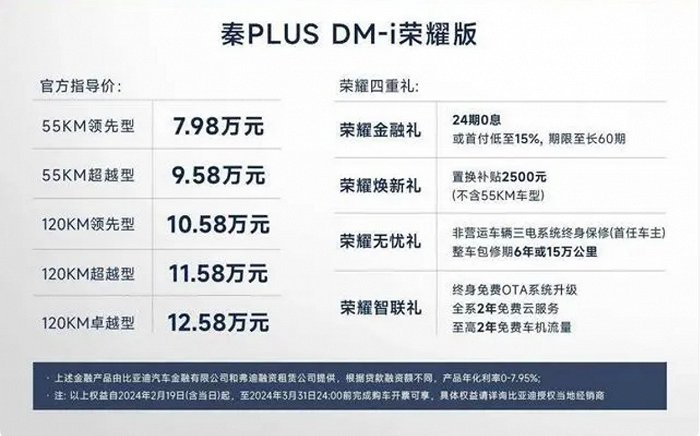 开年即上演的价格战,来得令消费者猝不及防。2月19日,比亚迪宣布,旗下两款插混车型秦PLUS荣耀版和驱逐舰05荣耀版上市,起售价为7.98万元,相较于上一版本冠军版车型,新版本车型价格直接下降了2万元。这次降价,首次将新能源混动车型价格拉低至7万元区间。