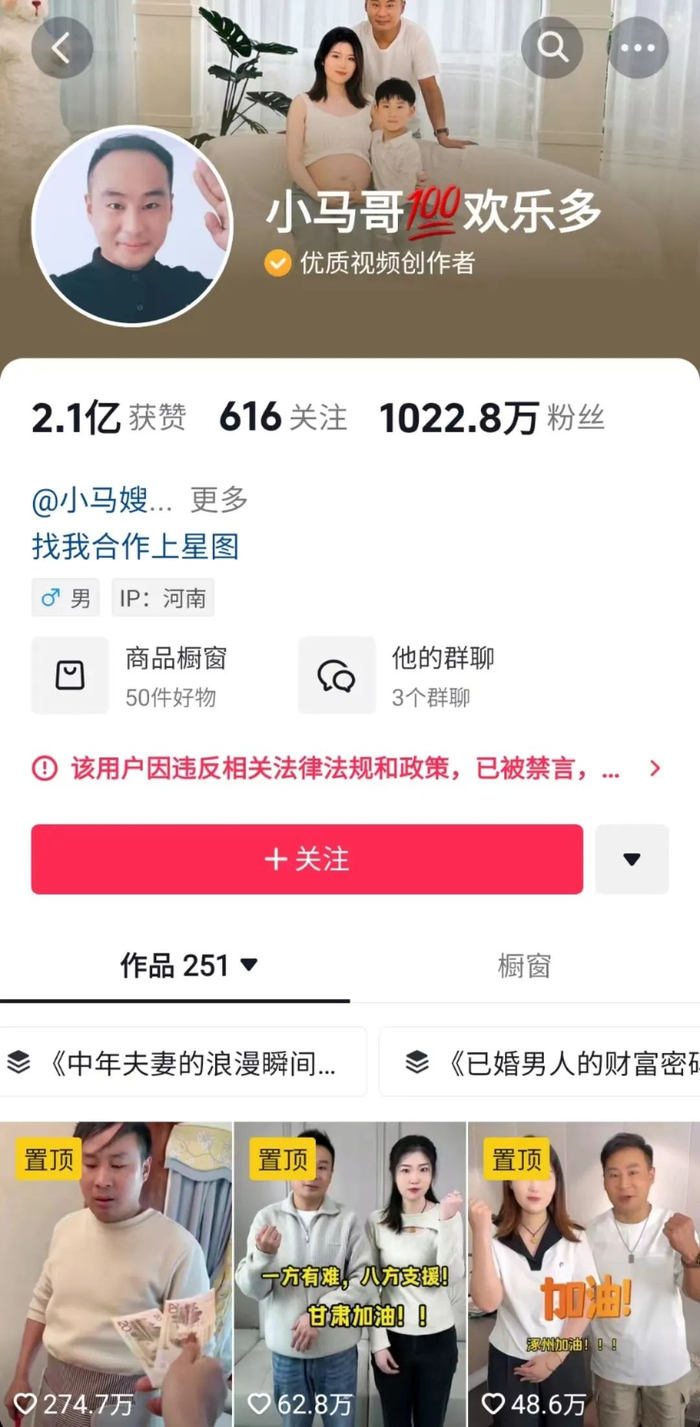 “小马哥”的视频多以家庭内容为主,更新频率为4—5天,但其最新一期视频发布于2024年2月19日,已有十余天未更新。根据平台提示,目前这一账号因违反相关法律法规和政策,已被禁言。