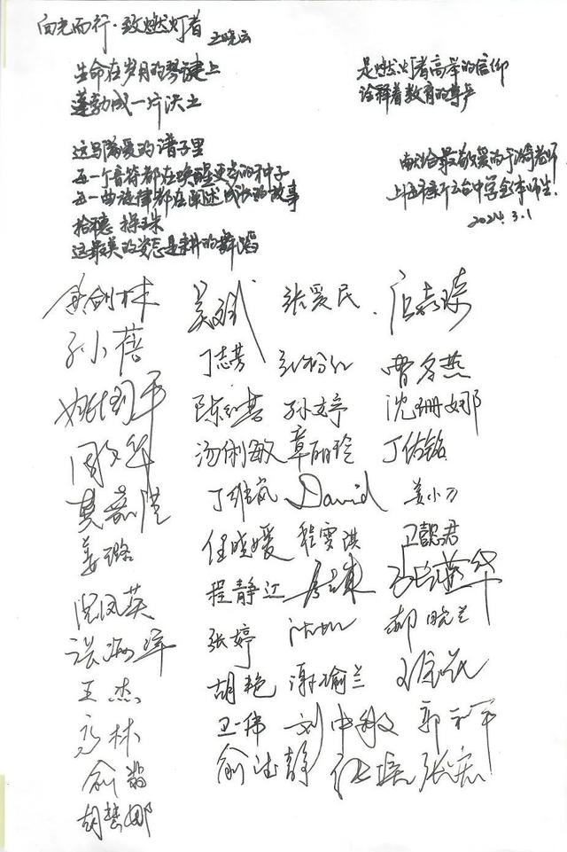 新云台中学全校教师签名于漪老师曾接手一个班,班里有四个说话结巴的孩子。她用了大量的精力终于找到了四个孩子各自的原因:有的是生理原因,有的是思维太慢,有的是思维太快,有的是心理上缺乏自信。她因材施教,用不同的方法耐心指导,四个学生最终都战胜了自我,表达流畅。于漪老师用自己的育人实践诠释心目中的教育理想——做一个大写的人,“‘大‘字中是一个顶天立地的’人‘,中间一横是教师张开的双手,拥抱学生、拥抱时代、拥抱教育事业。”