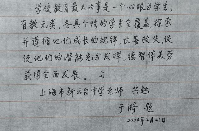 3月1日下午,上海市新云台中学携手建平教育集团、北蔡学区举行“以教育家精神为引领 做四有好老师”2024 师德师风主题教育启动仪式,邀请了于漪老师的孙女、上海市教师教育学院黄音老师来校主讲《从“草根教师”到“人民教育家”于漪老师教育故事》。令老师们惊喜的是,于漪老师还写来亲笔寄语:“学校教育最大的事是一个心眼为学生,有教无类,各具个性的学生全覆盖,探索并遵循他们成长的规律,长善救失,促使他们的潜能充分发挥, 德智体美劳获得全面发展。”