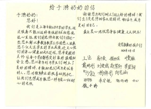 “我们是上海市新云台中学的学生,这次很高兴能以这样传统的方式和您说说心里话……”当把自己写的信交到黄音老师手中,六年级的王涵难掩心中激动。这封由新云台中学学生代表集体署名的信,表达了孩子们在于漪老师精神鼓舞下奋发努力、积极成长的愿望。