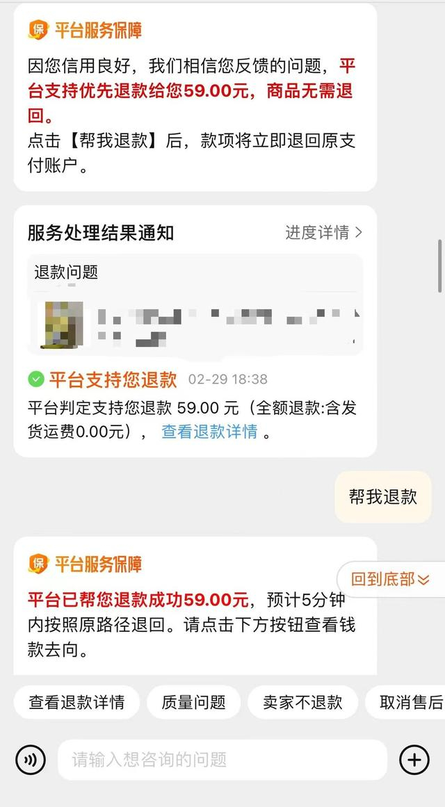 在淘宝平台,记者向官方客服提出退款申请,并按要求上传了图片凭证、备注描述。很快,客服对话框弹出提示“因您信用良好,我们相信您反馈的问题,平台支持优先退款给您,商品无需退回”。记者点击“帮我退款”按钮,随即收到了全部货款。