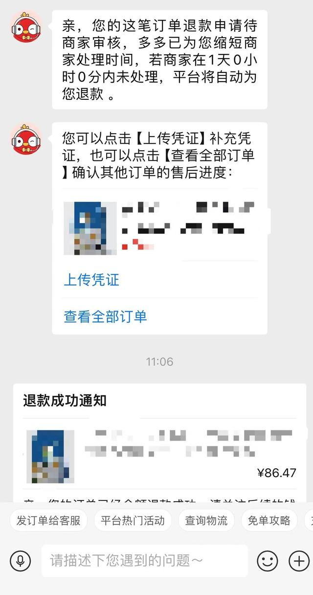 在拼多多平台,记者向拼多多官方客服发送商品实物外观图片,说明判断其质量存在问题的理由,提出退款不退货申请。随后,客服为记者开启售后单,帮记者向商家发起退款申请。对话框显示,商家会根据订单的具体情况进行处理。如果商家拒绝,顾客可以申请平台介入处理。如果商家在1天内未处理,平台将自动退款。