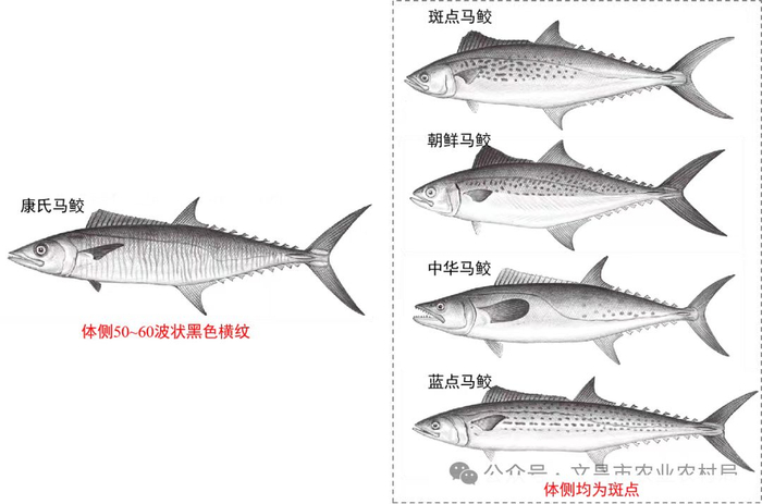 二看体高和头长,蓝点马鲛,体高小于头长;斑点马鲛,体高约等于头长;朝鲜马鲛,体高显著大于头长。