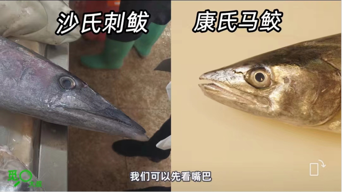 康氏马鲛和沙氏刺鲅的外形高度相似,但口感和价格均有较大差异。康氏马鲛属于鲭科马鲛属,沙氏刺鲅属于鲭科刺鲅属。二者可以通过外形区分,一是康氏马鲛嘴尖且短,沙氏刺鲅嘴更尖且长;二是康氏马鲛鱼身上的斑纹是又细又长,而沙氏刺鲅鱼身上的黑灰色斑纹则宽大得多,银白色的斑纹倒是又细又长。