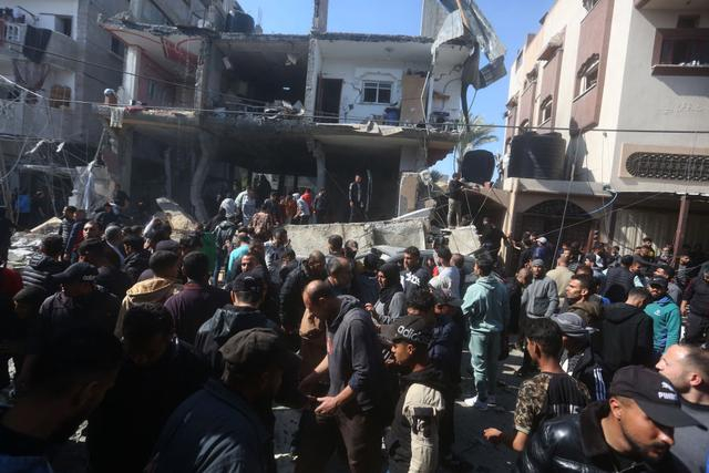 2月24日,在加沙地带南部城市拉法,人们聚集在遭以军空袭的建筑前。新华社发(哈立德·奥马尔摄)