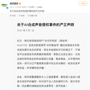 该声明称,微信用户“华仔共享团”及关联视频号“华仔集结号”通过技术手段伪造刘德华声音,在未经授权许可的情况下,于微信平台连续发布其剪辑拼凑的视频,导致公众发生误认,从而达到利用刘德华的知名度吸引流量、售卖商品、从中营利的目的。声明称,该行为已严重侵害刘德华的肖像权、姓名权以及声音权益,涉嫌构成诈骗。