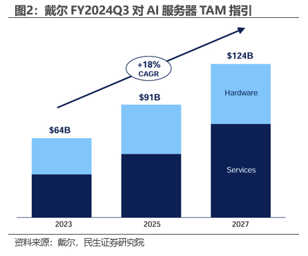AI推理端需求不断提升或推动算力需求进入全新阶段,戴尔大幅上调AI服务器全球TAM,2027年或达到1520亿美元。英伟达预计2023年40%的算力用于推理,同时各类应用正在加速转变为AI驱动,如消费者互联网公司正在投资生成式 AI,通过内容创作和广告、在线产品描述和人工智能购物辅助的自动化工具,为内容创作者、广告商和客户提供支持;企业软件公司正在应用生成式人工智能来帮助客户实现生产力的提高;推荐系统是地球上最大的单一软件引擎,而其正在由CPU驱动转向GPU驱动等。基于良好的AI服务器需求前景,戴尔预计2025/2027年全球AI服务器TAM分别达到1050亿美元/1520亿美元,高于FY2024Q3时预期的910亿美元/1240亿美元。