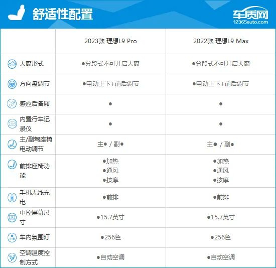 理想L9全系搭载由1.5T四缸发动机与前后双电机组成的增程式动力系统,CLTC纯电续航里程为215km,WLTC综合续航里程达到1100km。具体配置方面,两个年款车型的差别主要体现在传感器数量和辅助驾驶功能,其余配置基本一致。值得一提的是,理想L9全车配置几乎拉满,尤其是在便利性和舒适性配置方面,提供了带感应开启功能的电动后备厢、全车无钥匙进入、第一排和第二排座椅加热、通风、按摩以及三温区自动空调等等,大幅提升用车体验。