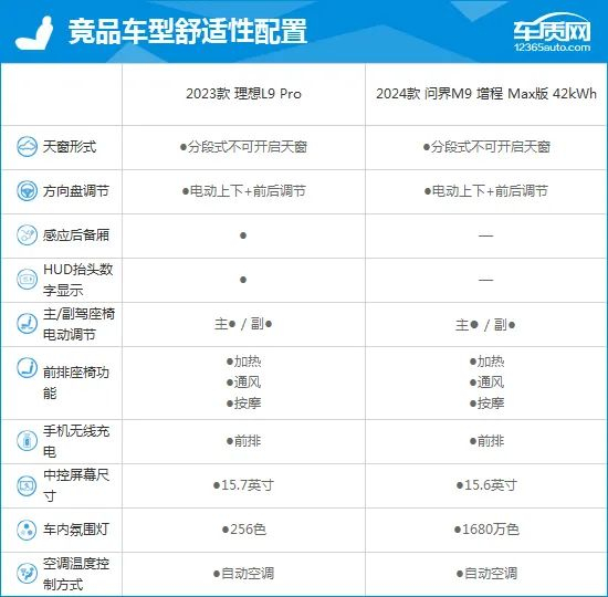 由于国内大型SUV市场主要以豪华品牌车型为主,综合考虑理想L9的产品特性和价格,目前只有问界M9与其定位相似,能够形成直接竞争关系。通过配置对比来看,2023款理想L9在中控屏幕尺寸和车机功能方面稍稍占优,搭载了15.7英寸OLED中控屏,屏幕分辨率高达2880x1620,显示效果相比问界M9的15.6英寸LCD中控屏更加出色。功能方面则比问界M9多出了手势控制、5G网络以及车内生物监测系统等,提升了日常用车的便利性和安全性。此外,在其他配置方面,2023款理想L9提供了问界M9所不具备的后排小桌板和空气质量监测功能,驾乘舒适性更好。